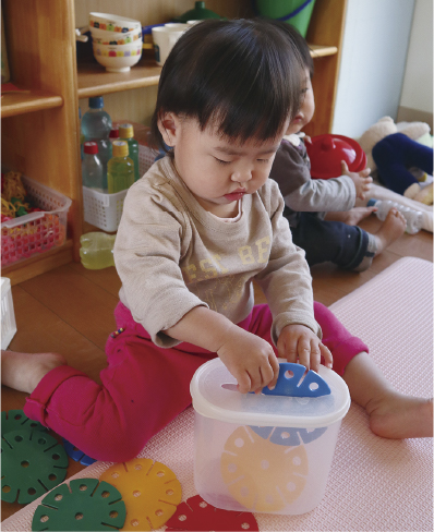 さまざまな道具に触れる中で、その感触を味わったり、大きさや量、色や形を知ったり、互いの関係を学んだりしながら、何よりその性質に合った手先の器用さを身につけようとします。