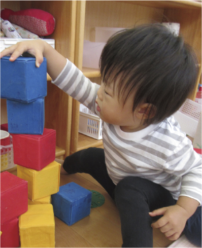 手先の器用さが育ち、高い低い、長い短い、大きい小さいなどの量を認識していきます。上半身を自由に動かせるようになり、手を使う遊びも増えてきます。それに伴って肩、腕、手、指の機能が発達していきます。視線を自分の手元に集中し、目と手の協調動作に連動しています。