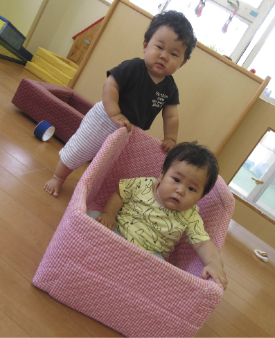 這う・つかまり立つ・歩き始めるなどの身体的機能の発達の幅が広いので、一人ひとりの発達を保障できる空間と場所・遊具を工夫しています。