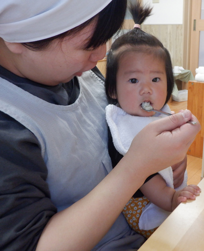 ひとりひとりの発達機能を考えながら、食事をすすめていきます。初めは大人の膝からのひとり食べから、歩行も自立し、上半身が安定して座っていられるようになった頃に椅子に降ろします。食事形態は、子どもの歯の生え状況や咀嚼力などに合わせ大きさや固さを調整しています。また、自食を急がせないで、口の中の動きをよく見て、それに合った形態や量を個別に対応しています。