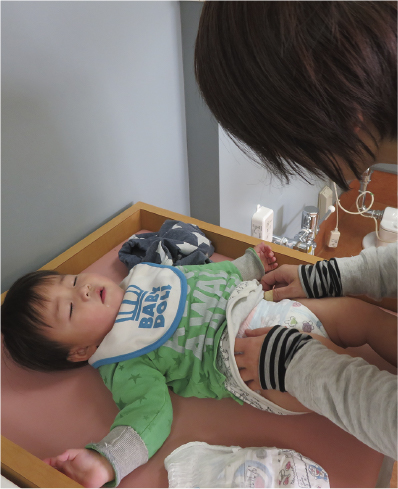 おむつ交換の場面は、大人と子どもが1対1でかかわることができ、親密な関係をつくる場として、大切にしています。子どもと目を合わせ、ゆっくりとした雰囲気の中で接する育児の場でもあります。